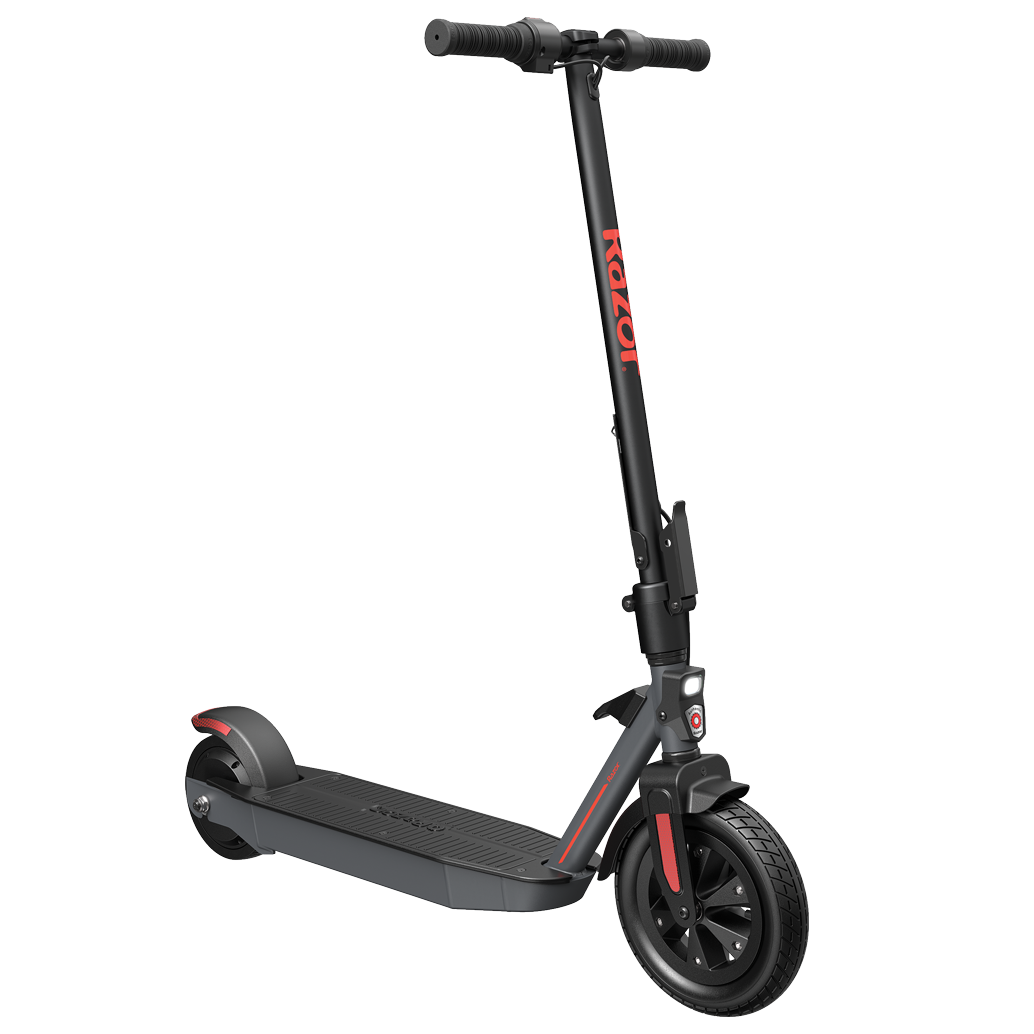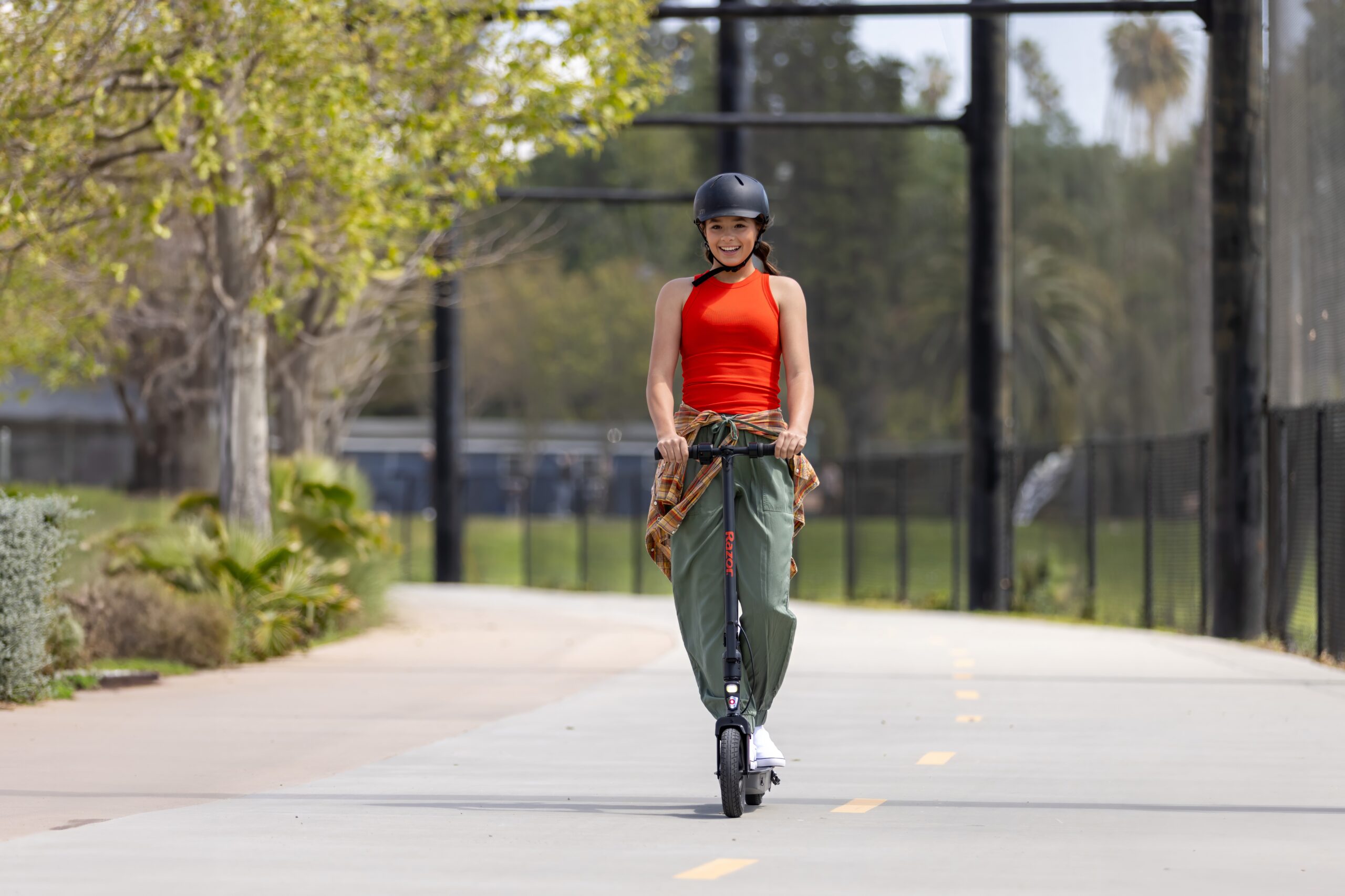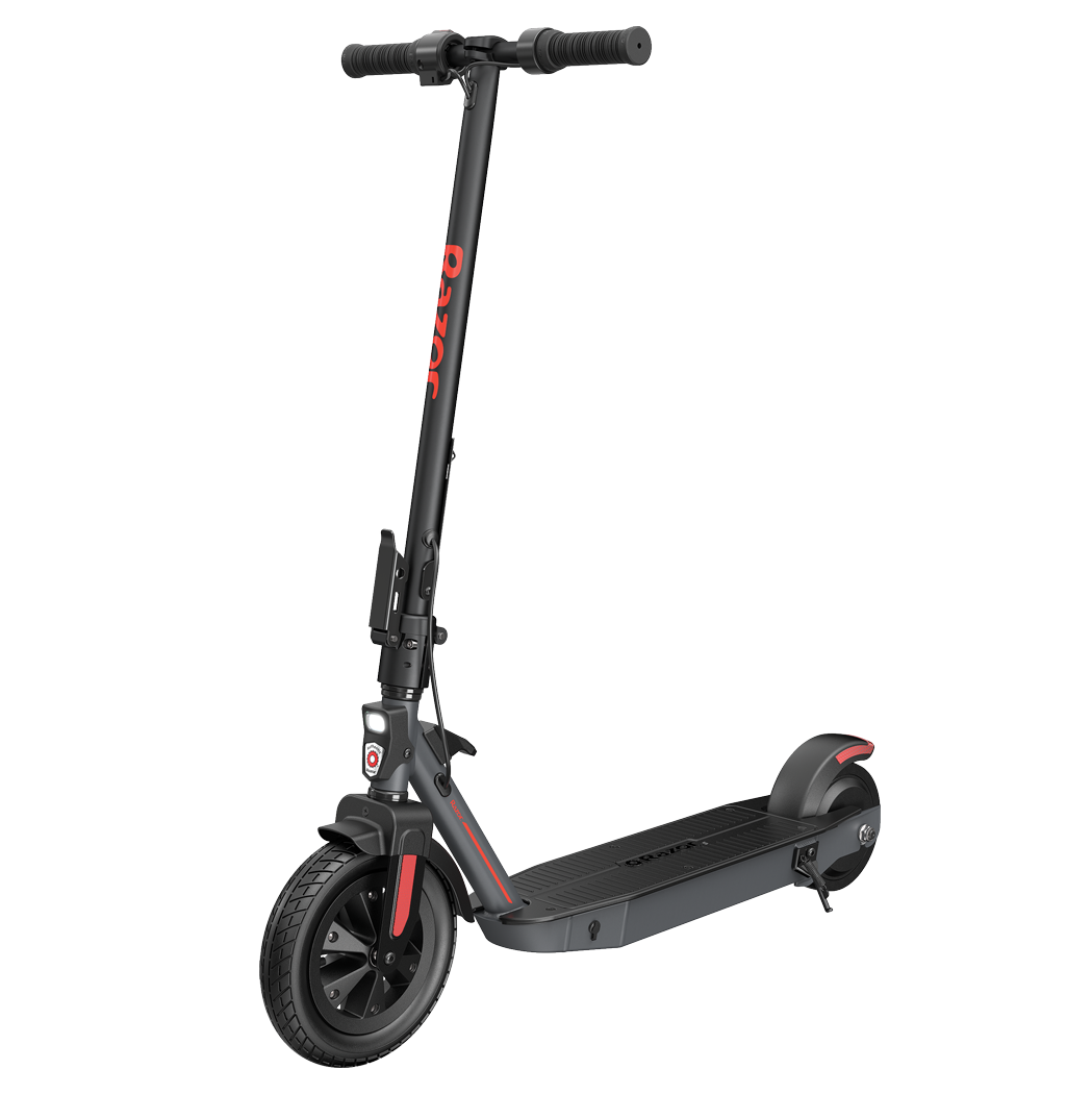 - The pneumatic 10″ (254 mm) front and the 7″ (170 mm) airless, flat-free rear tires allow riders to glide over various terrains.