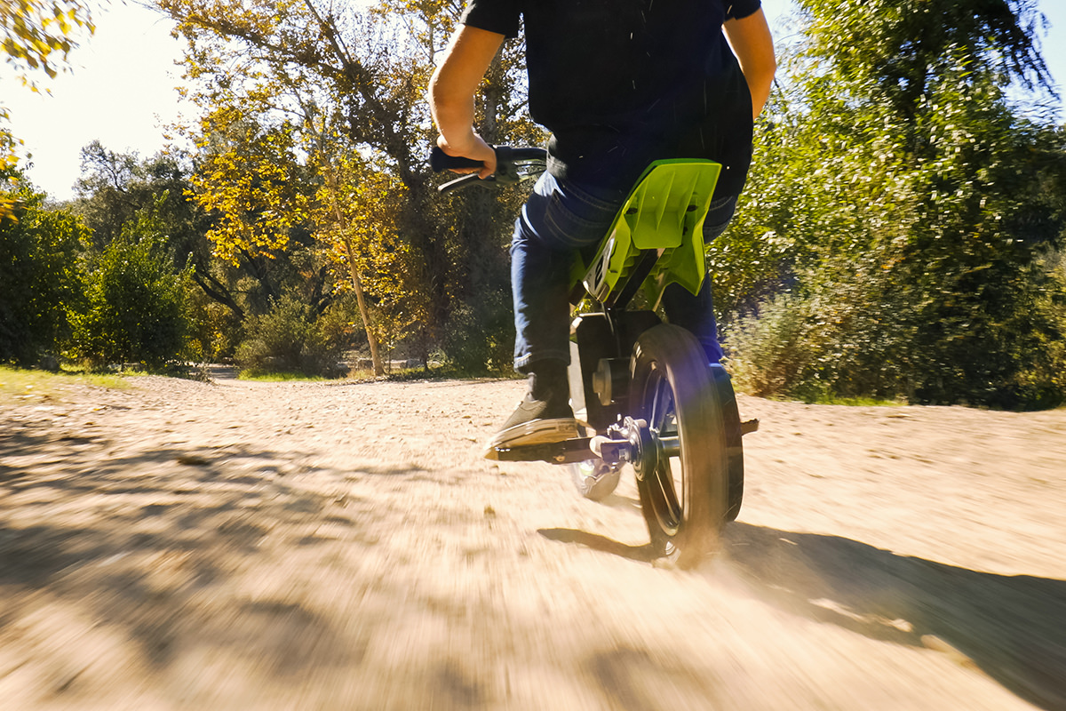 It’s smaller in size, but not in fun, with the same sturdy frame design, knobby tires, foam grips, and authentic features for off-road riding outings just like the big kids